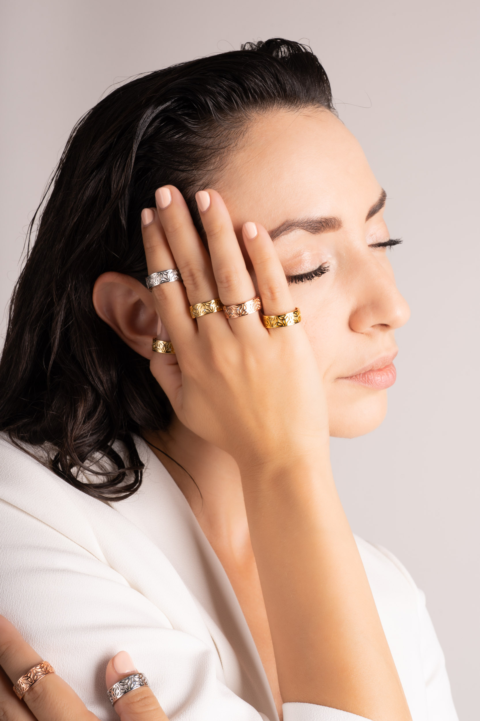 La collezione DUOMO si ispira agli ornamenti architettonici della facciata del Duomo di Orvieto. In particolare riprende il motivo che circonda la porta principale. Con la sua geometria a tre punte rappresenta la Santissima Trinità nella simbologia cristiana: il Padre, il Figlio e lo Spirito Santo. E’ inoltre simbolo di Amore Eterno e augurio di Longevità.